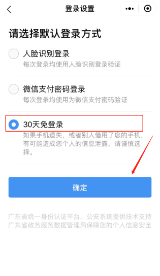 成功登录“粤省事”后,在“粤省事”主界面进入“个人中心”的“登录设置”,选择“30天免登录”(如图1-4)。