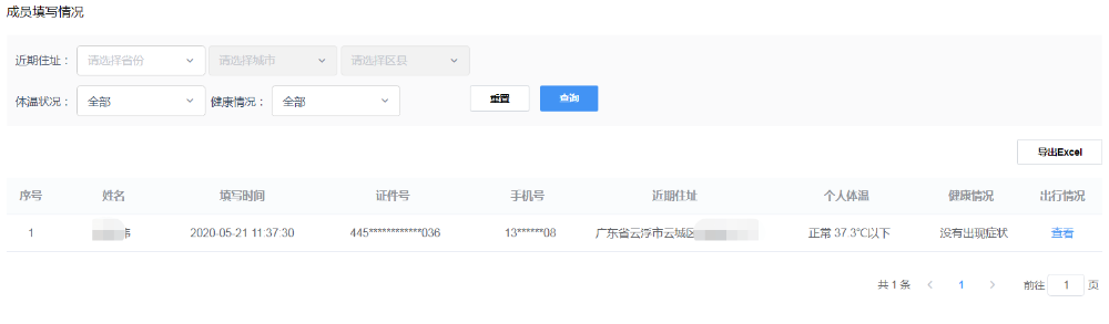 登录后,除了可以查看当天未申报人员名单外,还可以查看已申报人数的“体温登记占比、近期出行动向、健康登记占比、来粤方式、各成员详细情况”等(如图2-4)。