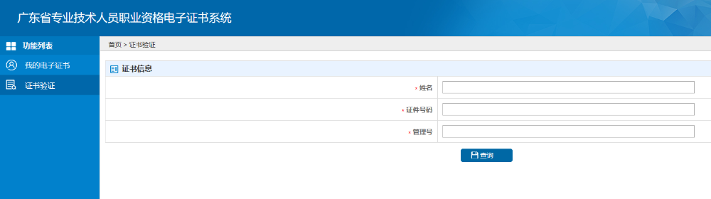 进入证书验证页面,根据证书信息输入“姓名”、“证件号码”、“管理号”查询、验证证书信息的真伪。