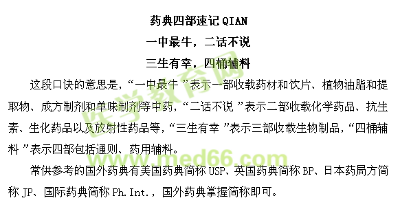 《中华人民共和国药典》,简称《中国药典》。每五年修订出版一次,共颁布了十版,现行版是2015年版。由一部、二部、三部和四部构成,一部收载药材和饮片、植物油脂和提取物、成方制剂和单味制剂等,二部收载化学药品、抗生素、生化药品以及放射性药品等,三部收载生物制品,本版药典首次将通则、药用辅料单独作为《中国药典》四部。为了方便大家记忆,钱韵文老师给大家编写了一组口诀。