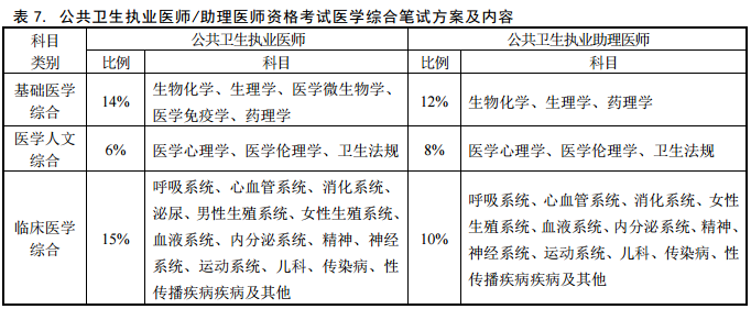 西医类医师资格考试医学综合笔试测试内容、考试形式以国家卫生健康委员会医师资格考试委员会审定颁布的《医师资格考试大纲》为依据。临床、口腔、公共卫生执业医师和执业助理医师以及乡村全科执业助理医师资格考试方案及内容见表5—表8