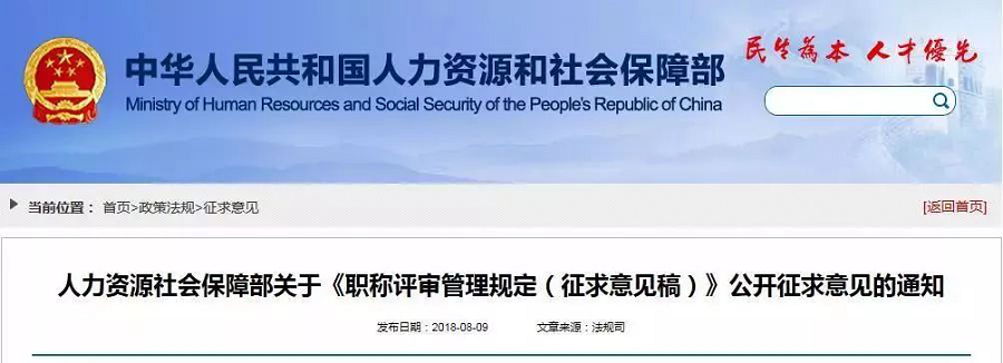 为贯彻落实中共中央办公厅、国务院办公厅印发的《关于深化职称制度改革的意见》,进一步规范职称评审工作,提高职称评审质量,人力资源和社会保障部起草了《职称评审管理规定(征求意见稿)》,并于近日公布全文向社会公开征求意见。