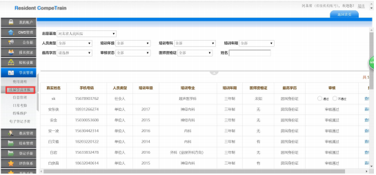 二、打开左侧菜单栏选择学员管理-往届学员审核(如下图),此时如无学员信息则为学员未注册,请联系学员重新注册完成注册后即可正常显示。