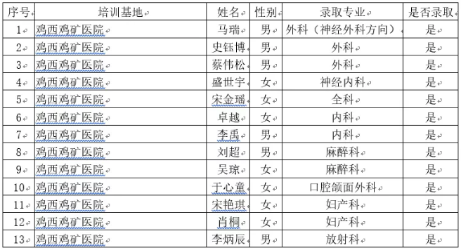 按照《黑龙江省卫生健康委 省中医药管理局关于做好2019年住院医师规范化培训及助理全科医生培训招收工作的通知》黑卫科教便函〔2019〕11号文件精神,结合我院实际招收录取情况,经省卫生健康委审核批准,确定我院2019年住院医师规范化培训第一批拟录取学员13人。现将录取名单予以公布(名单如下)