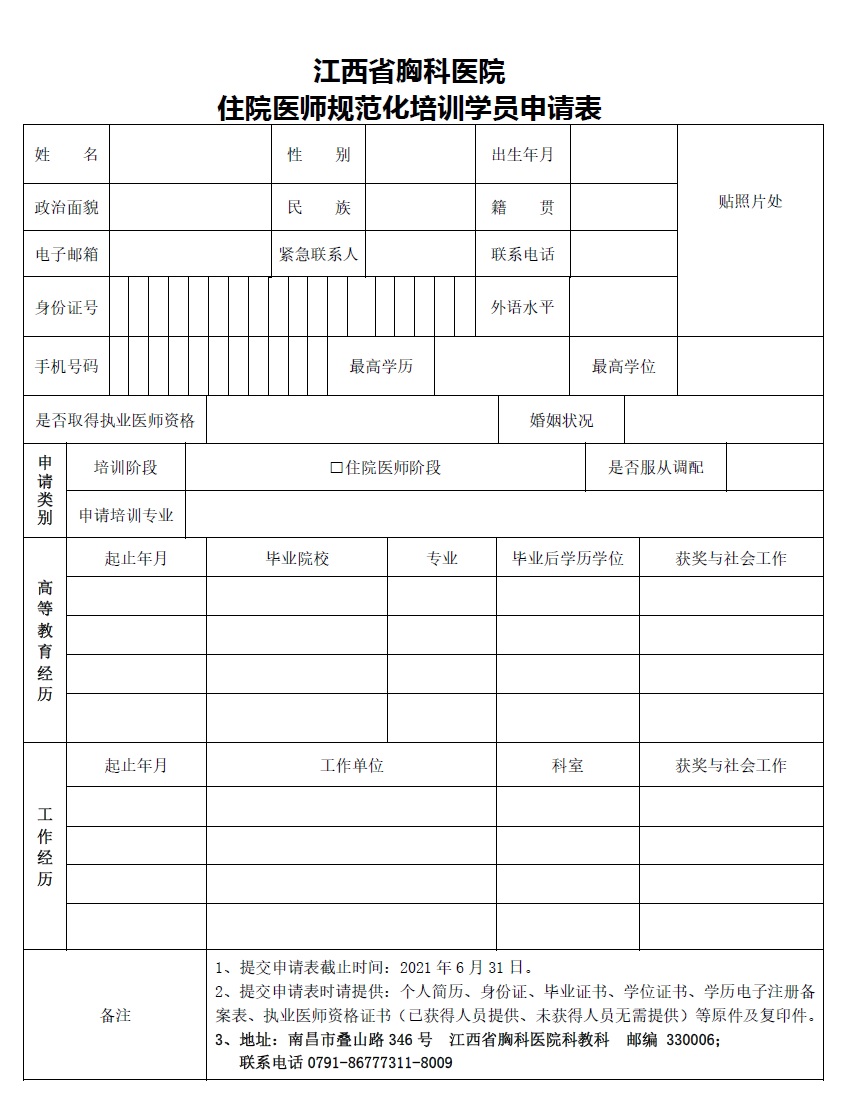 附件:《江西省胸科医院住院医师规范化培训学员申请表》