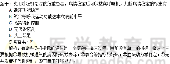 题干:使用呼吸机治疗的危重患者,病情稳定后可以撤离呼吸机,判断病情稳定的标志有