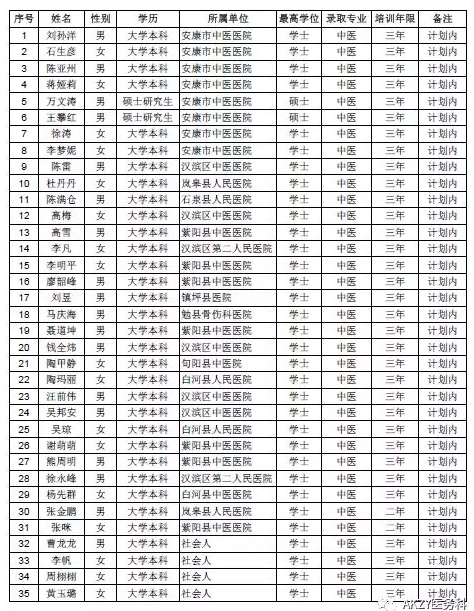 陕西省中医药管理局:2019年度住院医师规范化培训拟招录人员名单(中医类)