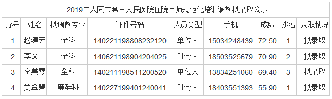 山西省卫生健康委员会发布2019年大同市第三人民医院住院医师规范化培训调剂拟录取公示通知,为帮助大家了解,医学教育网小编为您整理解答相关通知如下: