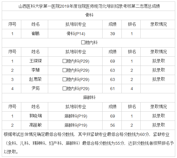 以上就是我为大家整理的山西医科大学第一医院2019年度住院医师规范化培训招录考核第二志愿总成绩,还请大家多多关注医学教育网,我们会随时更新更多更好的有关医学知识、医疗招聘及考试辅导等相关信息。敬请期待!
