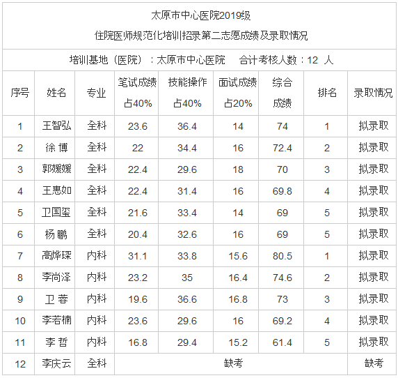以上就是我为大家整理的太原市中心医院2019级住院医师规范化培训招录第二志愿成绩及录取情况,还请大家多多关注医学教育网,我们会随时更新更多更好的有关医学知识、医疗招聘及考试辅导等相关信息。敬请期待!