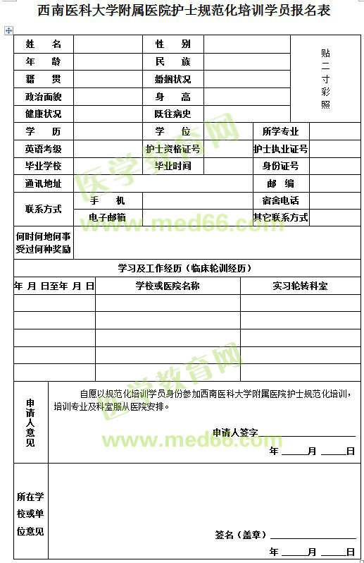 西南医科大学附属医院护士规范化培训学员报名表哪里有?医学教育网整理了相关报名表,具体如下: