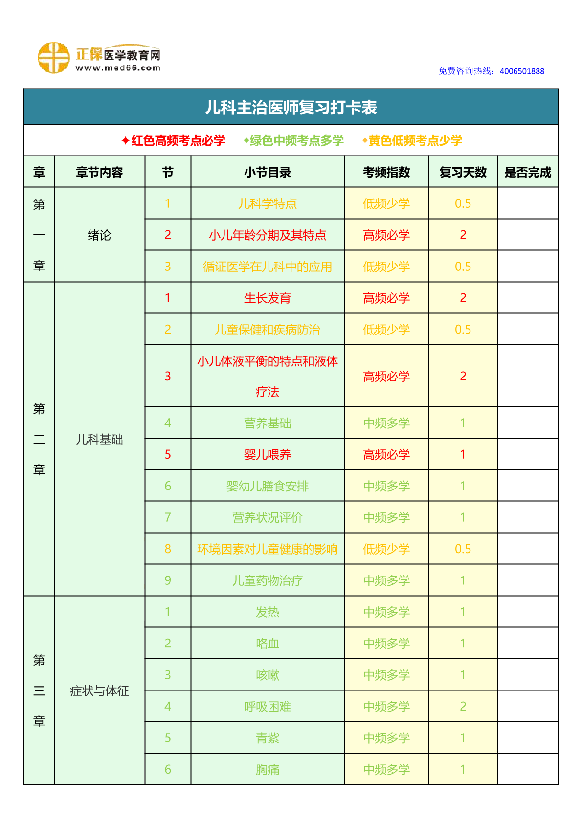 2026年儿科主治医师《复习打卡表》