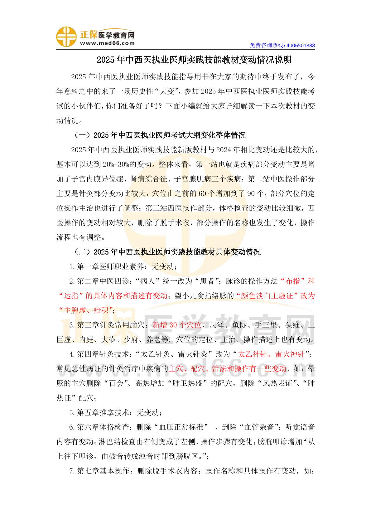 2025年中西医执业医师《实践技能》官方教材变动情况说明
